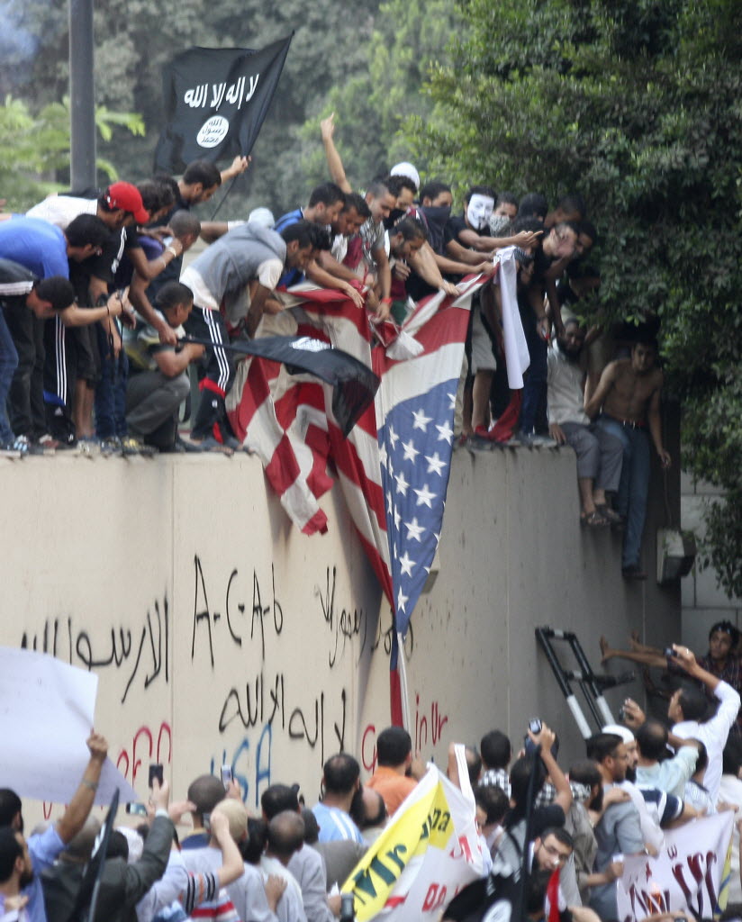 Protesters destroy an American flag pulled down from the U.S. embassy in Cairo, Egypt, Tuesday. Egyptian protesters, largely ultra conservative Islamists, have climbed the walls of the U.S. embassy in Cairo, went into the courtyard and brought down the flag, replacing it with a black flag with Islamic inscription, in protest of a film deemed offensive of Islam. (AP Photo/Mohammed Abu Zaid)