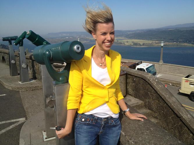 Next time you think you’re a bit wind-blown, consider Sally Showman, formerly of KXLY, who’s now working as a weathercaster/reporter for Portland’s KOIN-TV. Above, you see Sally handling 60 mph winds at the Vista House in the Columbia Gorge this afternoon. Sally gave Huckleberries permission to re-post this photo from her Facebook wall.