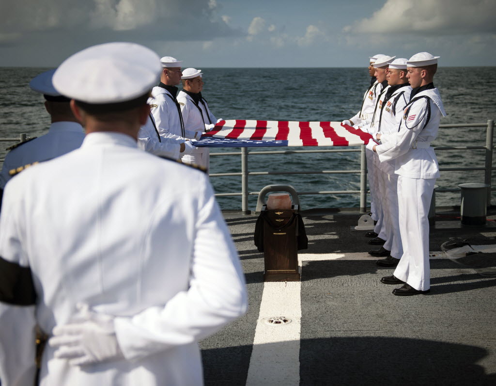 In this photo provided by NASA, members of the U.S. Navy ceremonial guard hold a United States flag over the remains of Apollo 11 astronaut Neil Armstrong during a burial at sea service aboard the USS Philippine Sea (CG 58) earlier today on the Atlantic Ocean. Armstrong, the first man to walk on the moon during the 1969 Apollo 11 mission, died Aug. 25. He was 82. (AP Photo/NASA, Bill Ingalls)