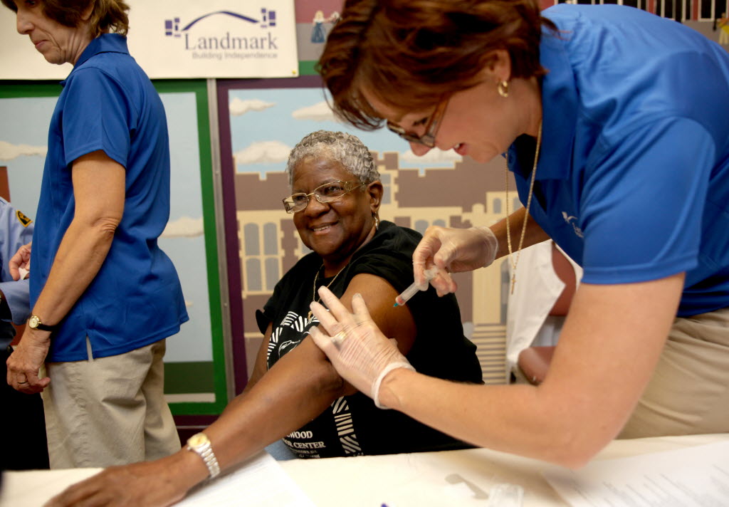 Kimberly Delp gives a flu shot to Carleen Matthews, of Pittsburgh, at the Flu + You Pittsburgh Event, at the Homewood Senior Center this morning in Pittsburgh, Pa. The Flu + You initiative led by the Allegheny County Department of Human Services, Area Agency on Aging, and Northern Area Multi-Service Center aims to educate older adults about the dangers of flu, the importance of annual vaccination, and available vaccination options. (Andrew Rush /AP Images for NCOA)