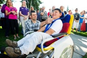 (Shawn Gust Coeur d’Alene Press photo: Todd Harkins interacts with his son Elijah, 6, following a presentation of a special bicycle from staff members of Frontier Communications)