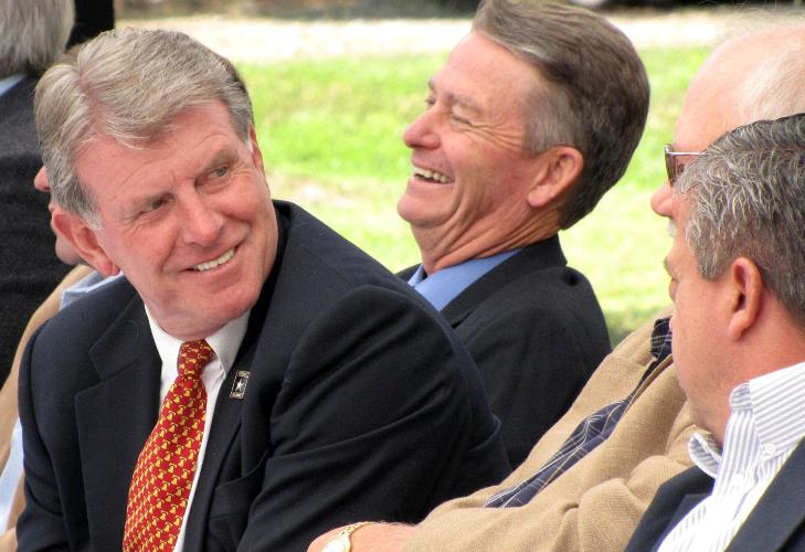 Someone must have said something funny at Nordman’s Capital for a Day event because Gov. Butch Otter is smiling and Lt. Gov. Brent Little is cracking up. Superintendent of Schools Tom Luna is on the far right. Dunno who the official is between Otter and Luna. Pecky Cox/As the Lake Churns snapped the photo.