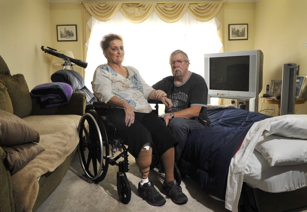 Jaclyn Milroy worked until two years ago when she developed congestive heart failure and lost a leg. Her husband, Tom, was diagnosed with cancer last February and had an ear removed. They say they can rarely afford to leave their north Spokane home. Chelsea Bannach SR story here . (SR photo: Dan Pelle)