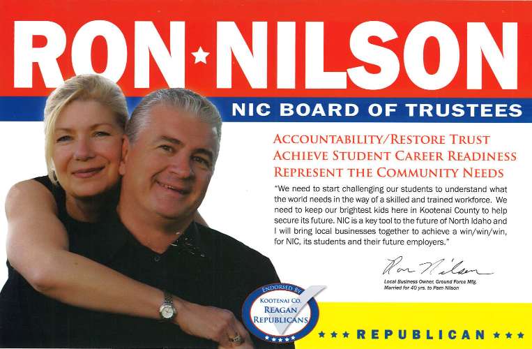 You don’t think the Kootenai County Reagan Republicans are out to take over the North Idaho College Board of Trustees as they have the Coeur d’Alene School Board. Check out the slick flyer above for Ground Force boss Ron Nilson, who’s running again for the NIC board. See the KCRR sticker on the slick advertisement? I also have a slick flyer for another Kootenai County Reagan Republican endorsee Paul Mathews.