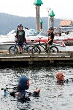 (Coeur d’Alene Press photo: 2 young brothers admire scuba divers Matt Hebener, bottom left, and Paul Schwartz, bottom right, as they prepare to go underwater)