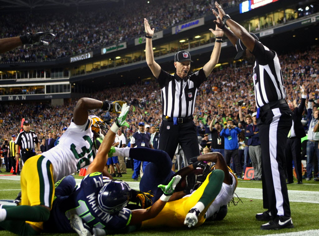 Officials signal after Seattle Seahawks wide receiver Golden Tate pulled in a last-second pass for a touchdown from quarterback Russell Wilson to defeat the Green Bay Packers 14-12 in an NFL football game, Monday in Seattle. The touchdown call stood after review. (AP Photo/seattlepi.com, Joshua Trujillo)