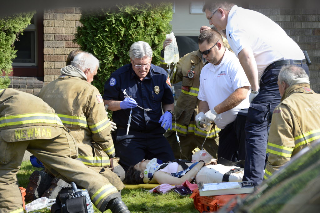 Emergency crews attend to a female who jumped from the 4th floor of the Culmstock Arms in Spokane. Assistant Spokane Fire Chief Brian Schaeffer said it appears the woman barricaded her door and built a fire, then sat on it. Once she was on fire she jumped out the window, he said. Story here . (SR photo)