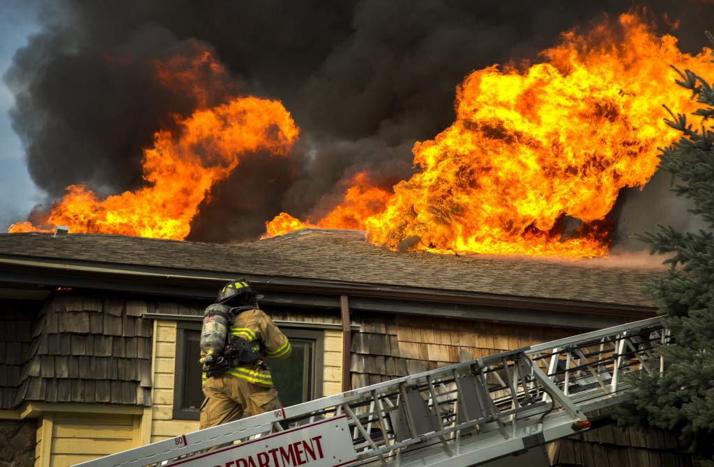 Facing a geyser of flames, a Spokane Fire Department firefighter leaves the roof of an apartment fire at 725 S. Lincoln/Spokane Tuesday afternoon. The raging fire displaced 24 residents. Story here. (SR photo: Colin Mulvany)