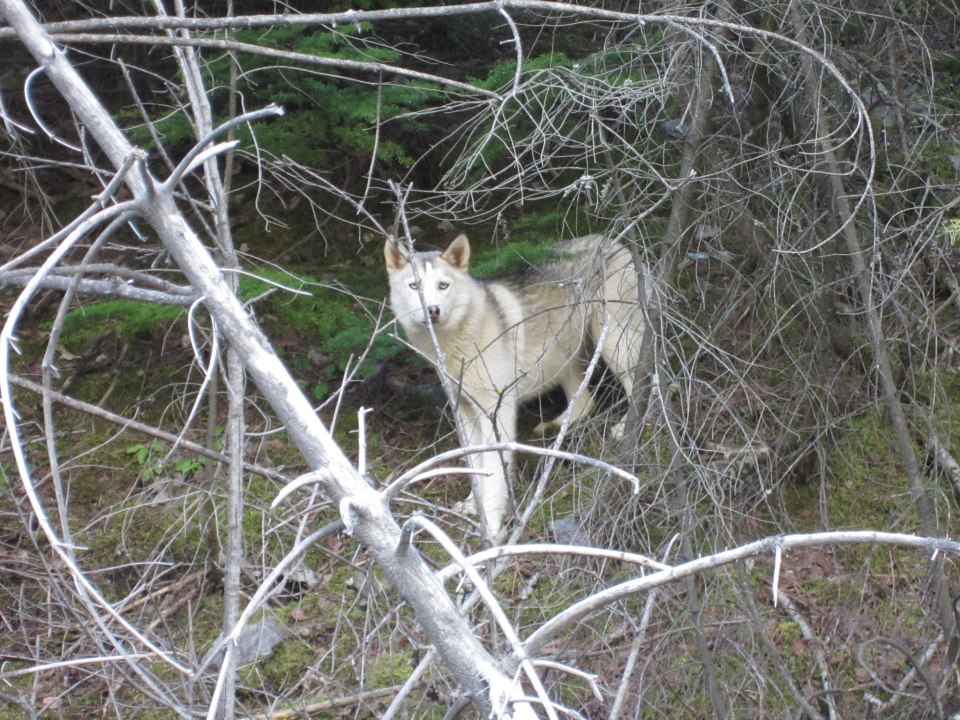 “This is tricky since I don’t think eye color as seen in the field can be diagnosic, but I’m leaning toward dog or hybrid. According to several sources I checked, wolves are usually born with deep blue eyes which lighten and then gradually fade into the adult eye color over the next six to 10 weeks. A mature wolf’s eyes are often amber/brown or gold, but also commonly come in hues of brown, gray, yellow, and green. Huskies often have blue eyes, and because of this people think there must be blue eyed wolves as well, but I have not seen mention of this. If you see a wolf with blue eyes and a nose that isn’t black it seems likely it’s a wolf-hybrid and not a full-blooded wolf. I’ll send the photo to a few biologists and see what they think.”