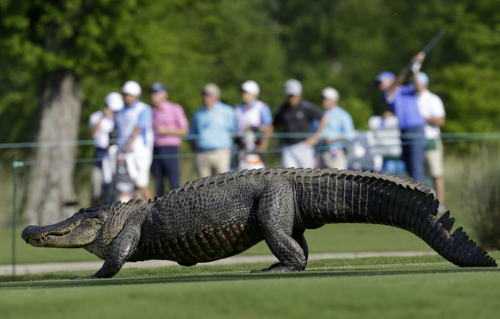 An alligator crosses the 14th fairway during the first round of the PGA Tour Zurich Classic golf tournament at TPC Louisiana in Avondale, La., on Thursday. You write the cutline. (AP Photo/Gerald Herbert)