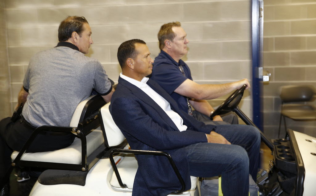 Security drives New York Yankee Alex Rodriguez who arrives at US Cellular Field in Chicago to play the Chicago White Sox tonight. (AP Photo/Charles Cherney)