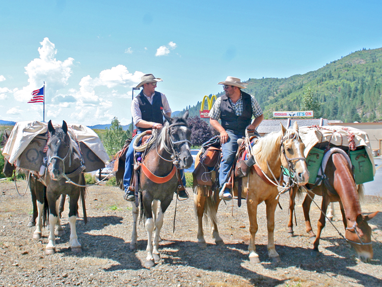 Jack Chambers, left, shares a laugh with cousin and Cowboys vs. Crohns partner Nick Roach after eating a lunch at McDonald’s in Kellogg before getting back on their horses and continuing their 1300-mile journey from Gardiner, Mont., to Bellingham, Wash. See story here . (Hagadone News Network photo: Bobby Atkinson)