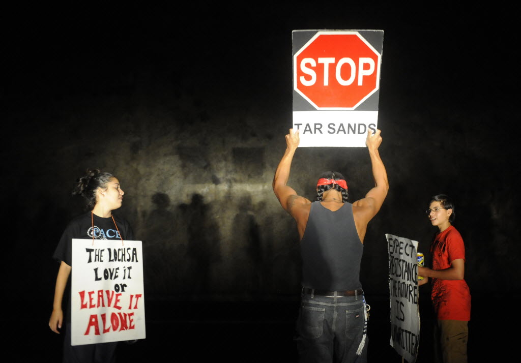 Brandon Metoxen, 24, a member of the Oneida Nation, center, is shown in headlights holding a sign protesting a megaload carrying an evaporator for a Canadian oil rig on U.S. Highway 12 outside of Lewiston on Tuesday. More here. (SR photo: Tyler Tjomsland)