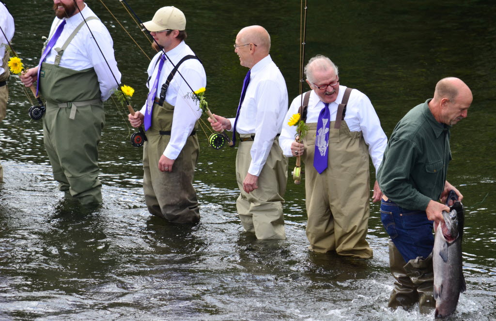 A groomsman stops to watch as a pair of king salmon are taken out of the Buskin River Saturday during the wedding of fishing guides Kadie and Dake Schmidt in Kodiak, Alaska’s Buskin River. The couple’s wedding rings were carried in the mouths of the salmon. You write the cutline. (AP Photo/James Brooks, Kodiak Daily Mirror)