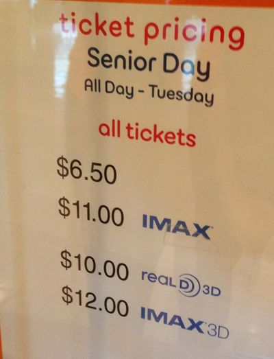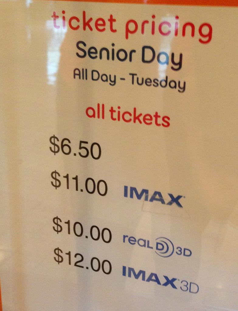 Turns out that applies to Tuesdays when, all day long, movie tickets for those age 60 and over, cost as follows: general admission $6.50, IMAX $11, Real D 3D $10 and IMAX 3D $12.