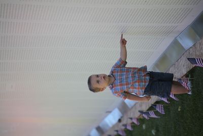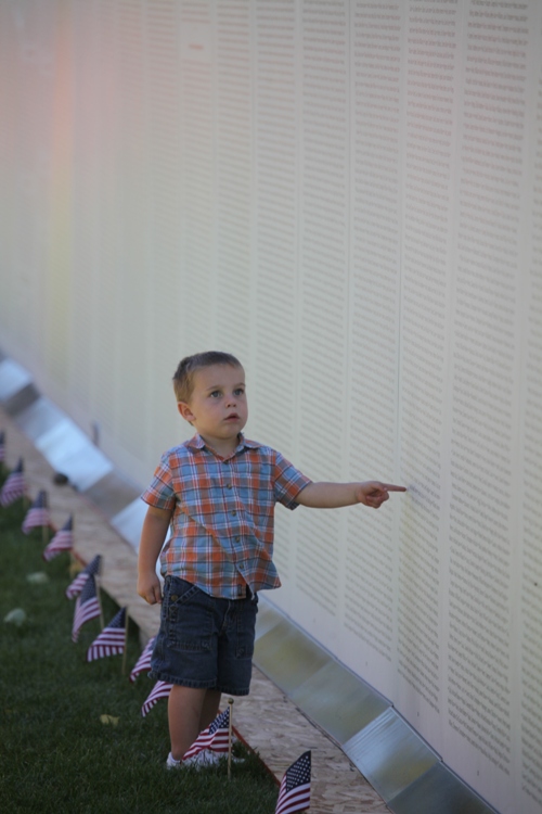 A small boy points to a name on one of the two traveling walls — Vietnam Veterans Memorial and Terrorism Wall of Remembrance — that visited Hayden City Hall area in recent days. (Photo: Duane Rasmussen)