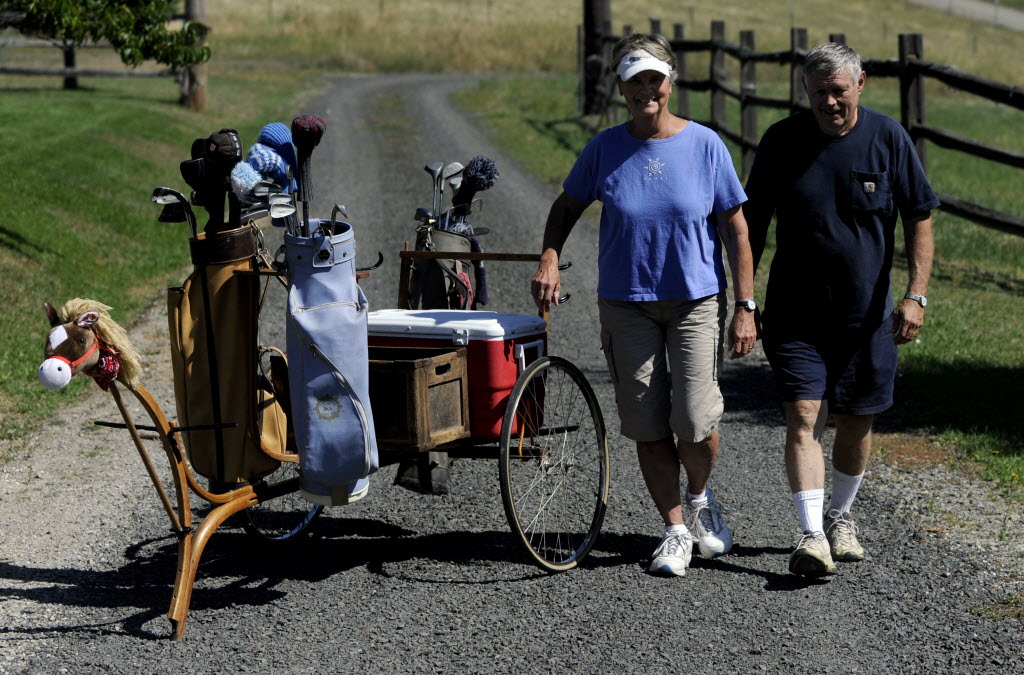 Tom and Wende Barker of Spokane Valley showed off have their golf cart at their home in Spokane Valley on Saturday. They will be using the cart for Cow Pasture Open, a Montana golf tourney. (SR photo: Kathy Plonka)
