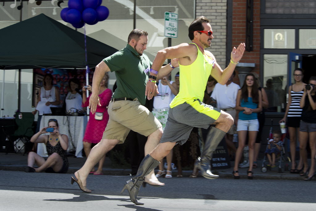 Rick Young, right, kicks his heels just a little faster than Dusty Wetzler as they compete in the Heels for HEALing Men’s Stiletto Sprint Sunday on 1st Avenue in downtown Spokane, Wash. Some 55 competitors participated in the benefit event with proceeds going to the The Women’s Healing and Empowerment Network. W.H.E.’s resources help survivors of domestic violence. Events for the day also included a costume contest, parade of shoes for auction, marshmallow stomping, and street dancing. ( Dan Pelle SR photo essay here )