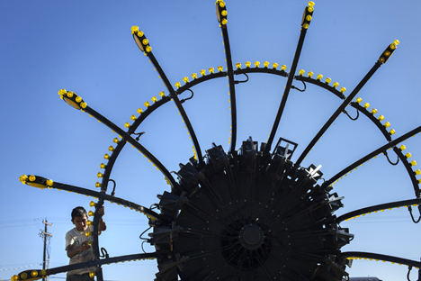 A fair worker installs lights on a ride Tuesday at the Kootenai County Fair Grounds in preparation for the fair running today through Sunday. (Coeur d’Alene Press photo: Gabe Green)