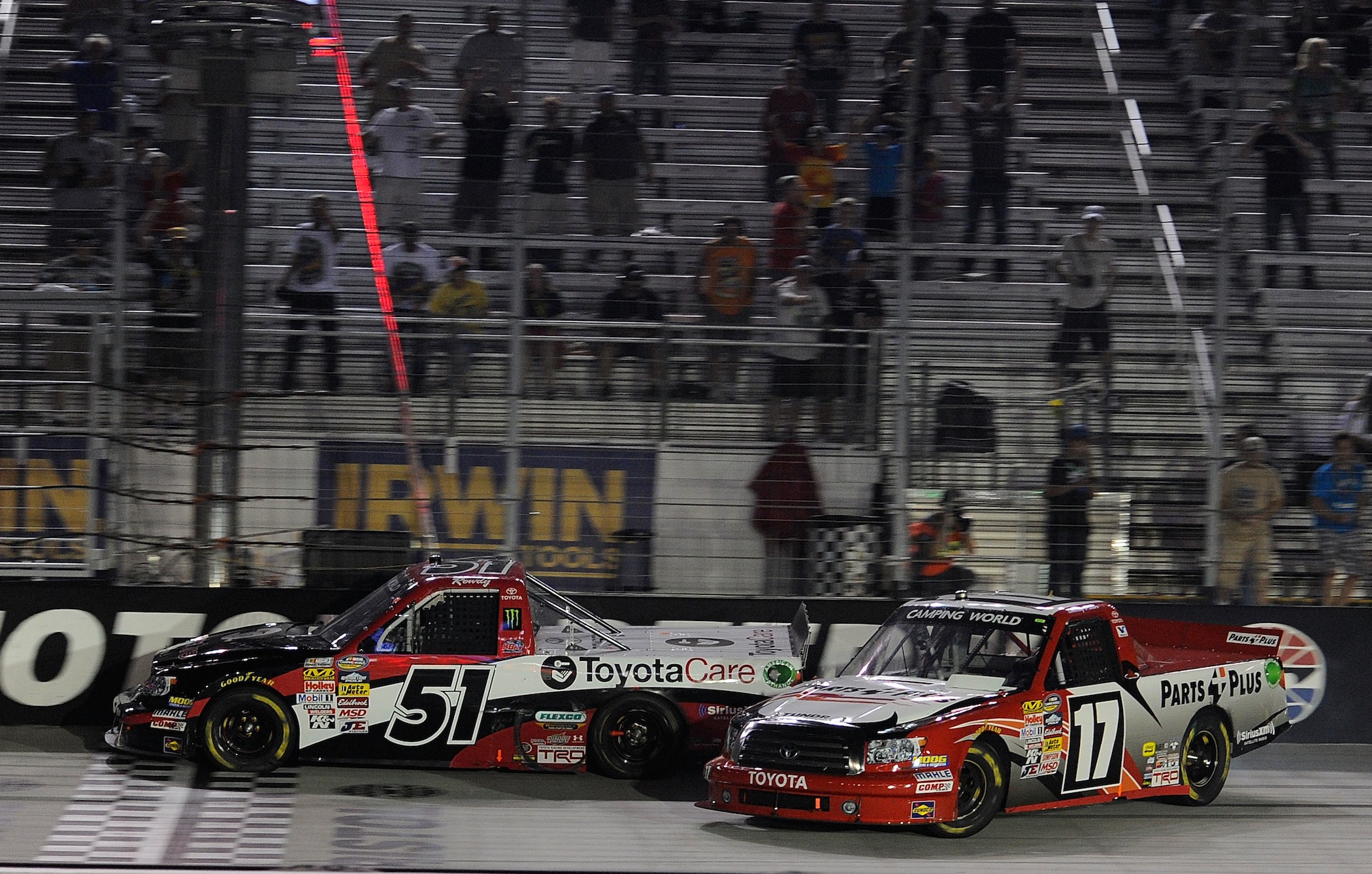 The pair of Toyota Tundras crossed the start-finish stripe literally side-by-side with Peters - who’d held a two-second advantage when the night’s fourth caution waved on lap 179 - crashing into the inside barrier.