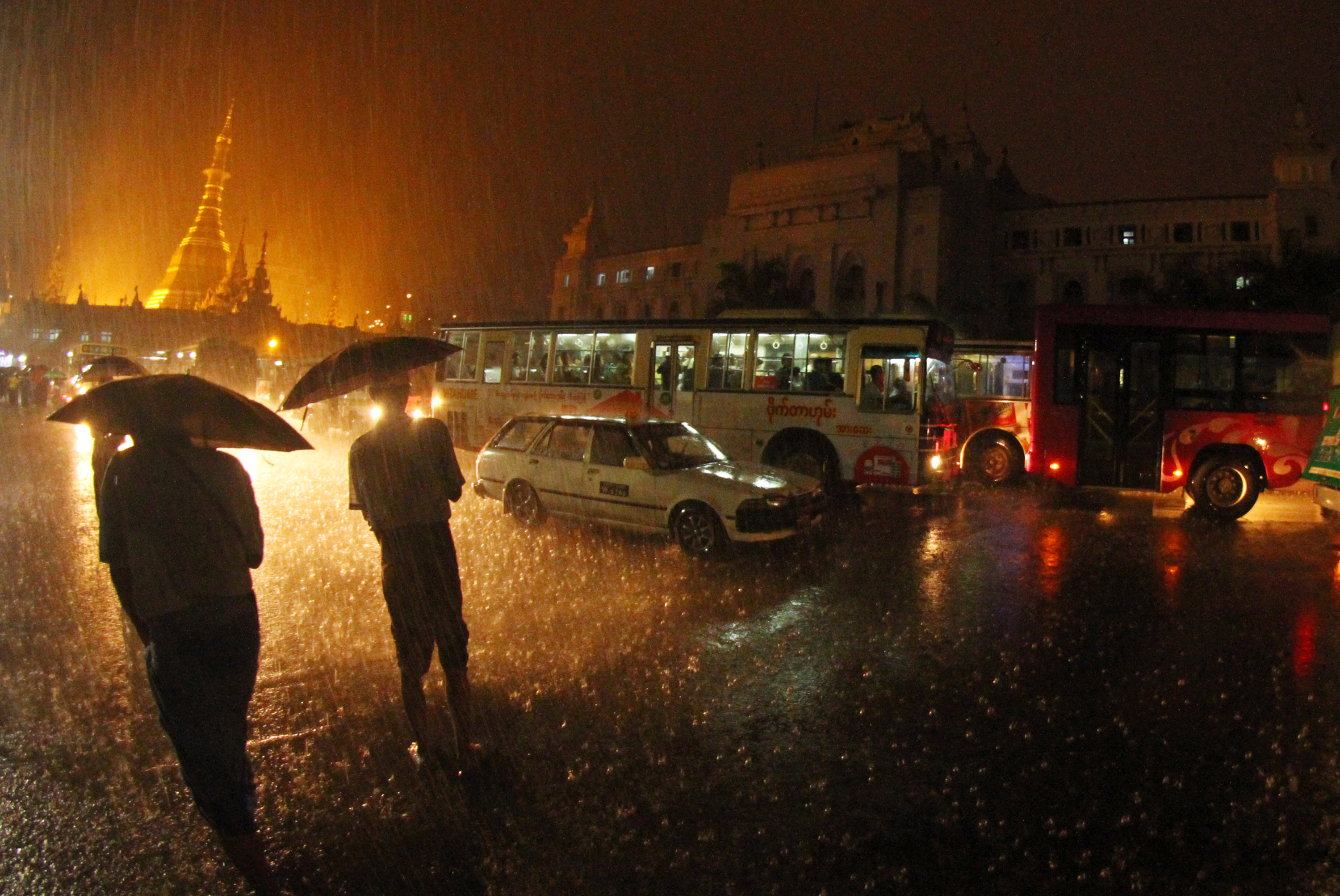 Pedestrians make their way along a flooded road while vehicles make slow progress in heavy traffic on Thursday, Aug 22, 2013, in Yangon, Myanmar. Heavy rains on Thursday evening caused road flooding and traffic congestion in many parts of Yangon.