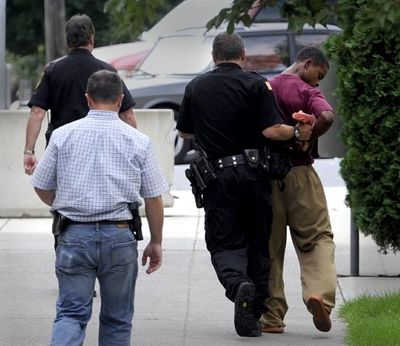 Demetruis Glenn, far right, is forcibly redirected by authorities Monday after turning to try to view onlookers who were hollering words of support for him near the county’s juvenile jail. (SR photo: Jesse Tinsley)