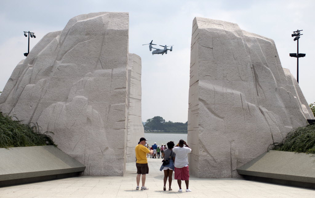 A Osprey military helicopter flies by the Martin Luther King Jr. Memorial in Washington on Tuesday. Barack Obama, who will speak, was 2 years old and growing up in Hawaii when Martin Luther King Jr. delivered his “I Have a Dream” speech from the steps of the Lincoln Memorial. Fifty years later, the nation’s first black president will stand as the most high-profile example of the racial progress King espoused, delivering remarks at a nationwide commemoration of the 1963 demonstration for jobs, economic justice and racial equality. (AP Photo/Carolyn Kaster)