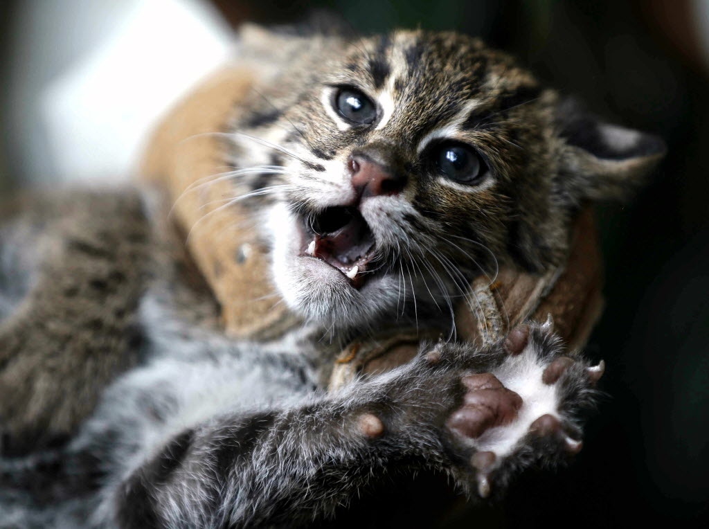 A zoo keeper holds one of three eight week old fishing cat cubs at the zoo in Duisburg, Germany, earlier today. The cubs with webs on their paws are quite rare and belong to a threatened species. The cats are able to swim to chase for fish. (AP Photo/FrankAugstein)