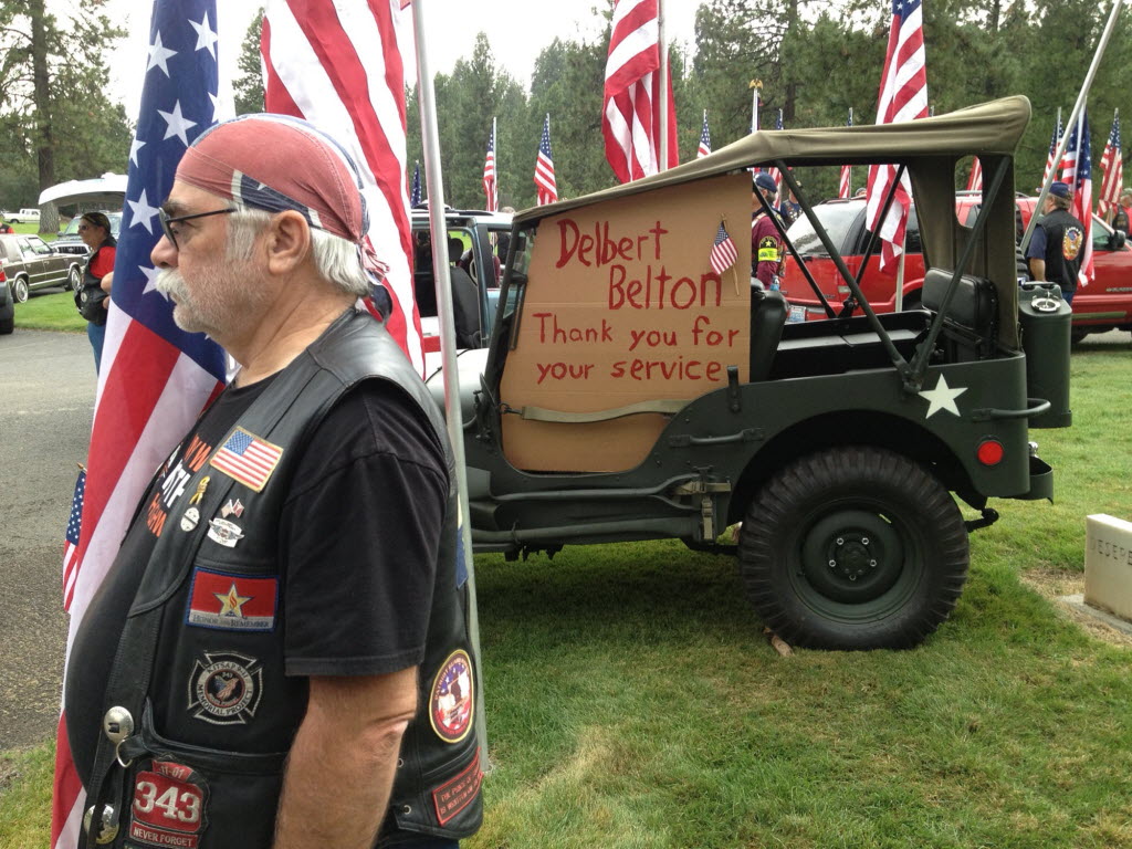 Dave Kastel with the Patriot Guard Riders, stands sentry before the graveside service for Delbert “Shorty” Belton at Greenwood Memorial Terrace today. (SR photo: Colin Mulvany) And: photo essay by Colin Mulvany/SR here.