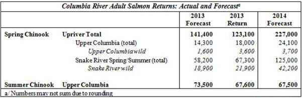 The numbers suggest that almost twice as many spring chinook will return to the system to delight anglers in 2014 while the numbers of summer chinook bound for the upper Columbia could be slightly down.