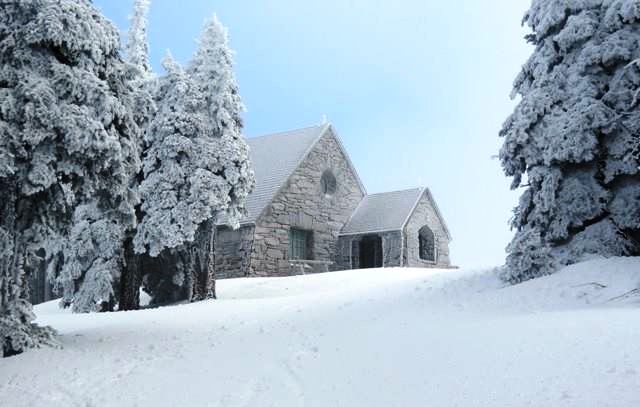 Snowshoer Warren D. Walker found the footing firm and the Vista House coated with frost on the mountain summit this week (above).