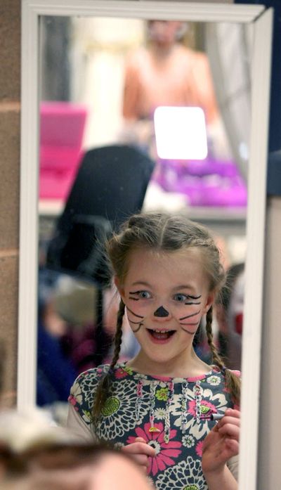 Ginny Acker, 8, checks out her mouse makeup in the mirror as she and fellow dancers get ready for dress rehearsal for the Peninsula Dance Theatre’s production of the Nutcracker in Bremerton, Wash. (AP Photo/Kitsap Sun, Meegan M. Reid)