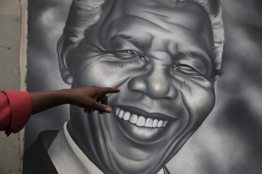A man points at a painting of former South African President, Nelson Mandela in Lagos, Nigeria, Friday. Mandela passed away Thursday night after a long illness. He was 95. As word of Mandela’s death spread, current and former presidents, athletes and entertainers, and people around the world spoke about the life and legacy of the former South African leader. (AP Photo/Sunday Alamba)