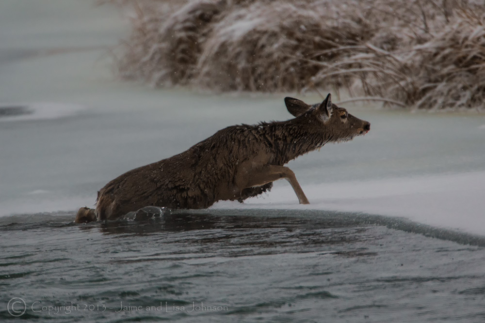Then, right behind her – a mountain lion appeared. He hit the brakes when he saw us, turned and vanished instantly (no pictures). The doe was swept downstream about a hundred feet or so before she could get started up on the ice. She managed (after several attempts) to get her front legs up on the ice, but couldn’t seem to get her hind legs up. She laid there for a few minutes and then flailed until her hind legs got up. We could tell she was freezing, but could do nothing. She walked about 15 feet and shook as much water off as she could, barely able to walk. She eventually laid down and stayed there for the next six hours. She eventually got up and fed away.
