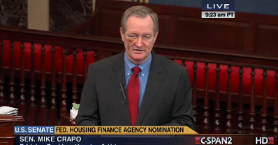 This shot on C-SPAN was posted by the Daily Caller , which ran an item headlined, “What is the cut on Sen. Crapo’s face?” The online outlet reported that C-SPAN junkies noticed the facial injury when Crapo was speaking yesterday against confirming Rep. Mel Watt to lead the Federal Housing Finance Agency. Their post drew an array of responses, including one commenting, “Looks like someone knocked the Crapo out of him.”