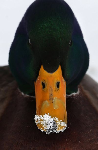 A mallard duck’s beak is covered in snow after rooting around for food in snow-covered Alton Baker Park in Eugene, Ore., Tuesday. You write the cutline. (AP Photo/The Register-Guard, Kevin Clark)