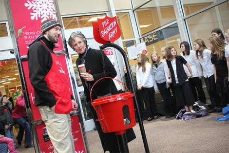 In this 2011 photo from the Salvation Army Kroc Center Facebook wall that was published on Huckleberries, Mayor Bloem is shown at her post by a Red Kettle at Fred Meyer. With her is Charlie Miller of the North Idaho Centennial Trail Foundation, and the sixth-grade choir of Lakes Middle School.