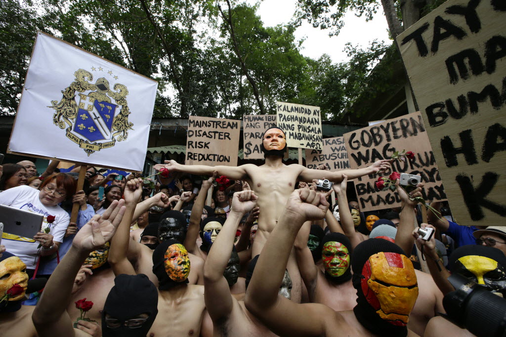 Masked fraternity members from the country’s premier state University of the Philippines, Diliman, display placards during their naked run today at their campus at suburban Quezon city, northeast of Manila, Philippines. The annual “Oblation run” evolved into a protest to draw the attention of the government, with this year’s theme of calling on the government to unite to fight corruption and to deal swiftly in times of calamities and natural disasters. You write the cutline. (AP Photo/Bullit Marquez)