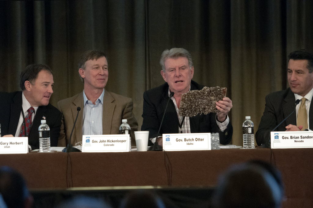 Idaho Gov. Butch Otter, second from right, shows a license plate covered in foreign sea mussels during the Western Governor’s Association annual report at the Mandarin Oriental hotel in Las Vegas, Thursday. Looking on are Utah Gov. Gary Herbert, left, Colorado Gov. John Hickenlooper, second from left, and Nevada Gov. Brian Sandoval, right. The association includes governors from 19 states in the West, as well as Guam and American Samoa. Story here. (AP Photo/Las Vegas Review-Journal, Erik Verduzco)