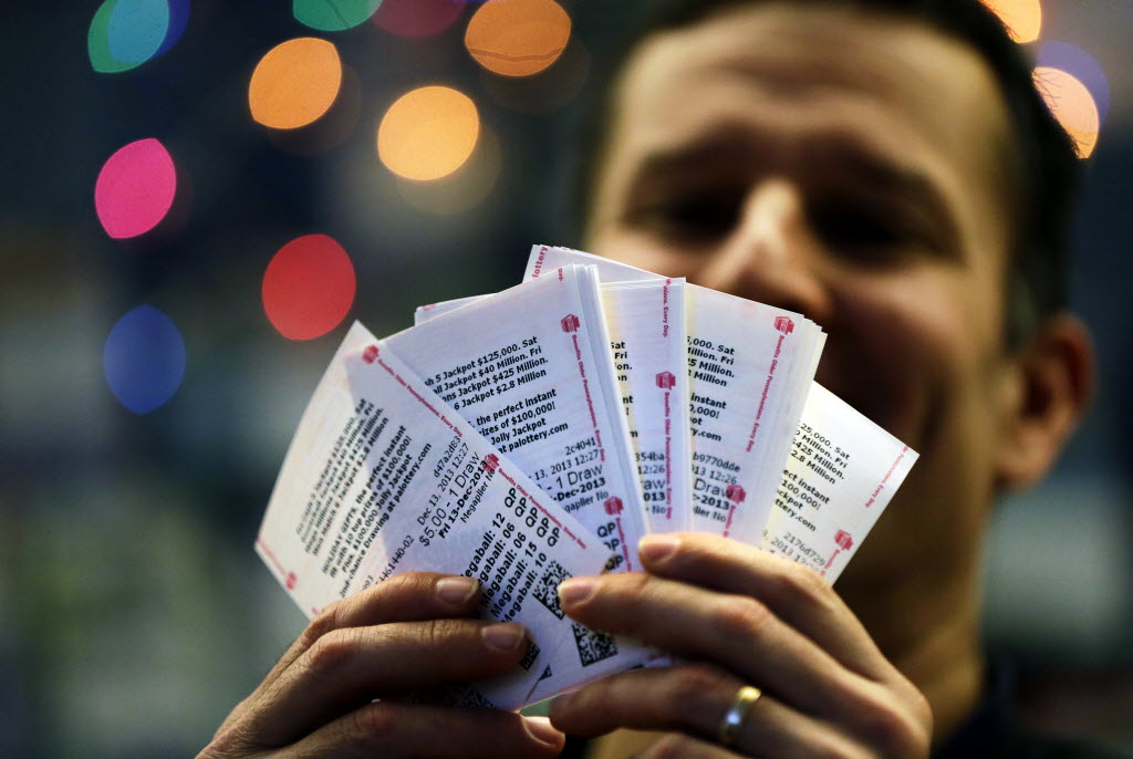 During an interview with the Associated Press, Chad Cuneo displays Mega Millions lottery tickets he purchased at a newsstand Friday in Philadelphia. Superstition didn’t deter players hoping that Friday the 13th will bring them good luck in the Mega Millions game as heavy sales prompted lottery officials to boost the estimated jackpot to $425 million. Story here. (AP Photo/Matt Rourke)