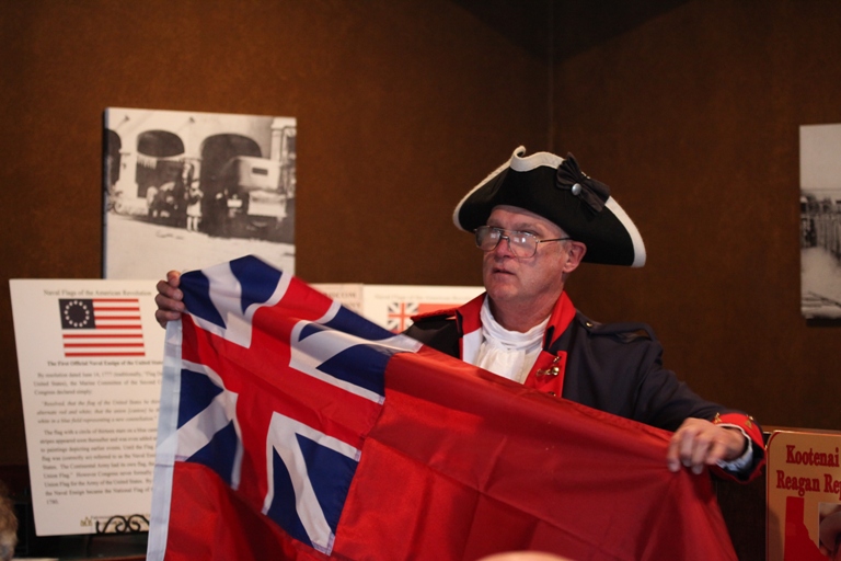 At noon Thursday, Stan Wills, a representative of the Sons of the American Revolution, spoke to the Kootenai County Reagan Republicans about the history of the United States and its flags. Membership in Wills’ organization is limited to “any male, who is a lineal decendent of an ancestor who supported the war of American Independence.” The flat Wills is holding is a U.S. Naval flag, which was used before the United States developed its unique design. Americans didn’t like it because of its simularity to the British flag. (Photo: Duane Rasmussen)