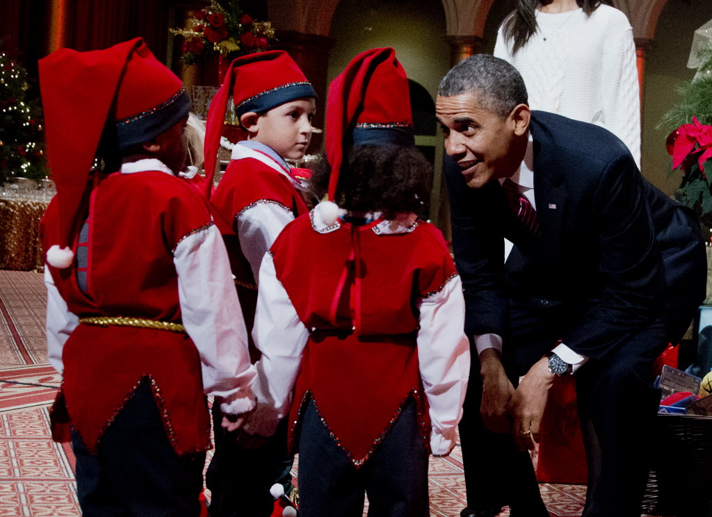President Barack Obama greets children dressed like elves at the National Building Museum in Washington, Sunday. The first family is attending the taping of the annual 2013 Christmas in Washington, celebrating its 32nd year anniversary. You write the cutline. (AP Photo/Manuel Balce Ceneta)