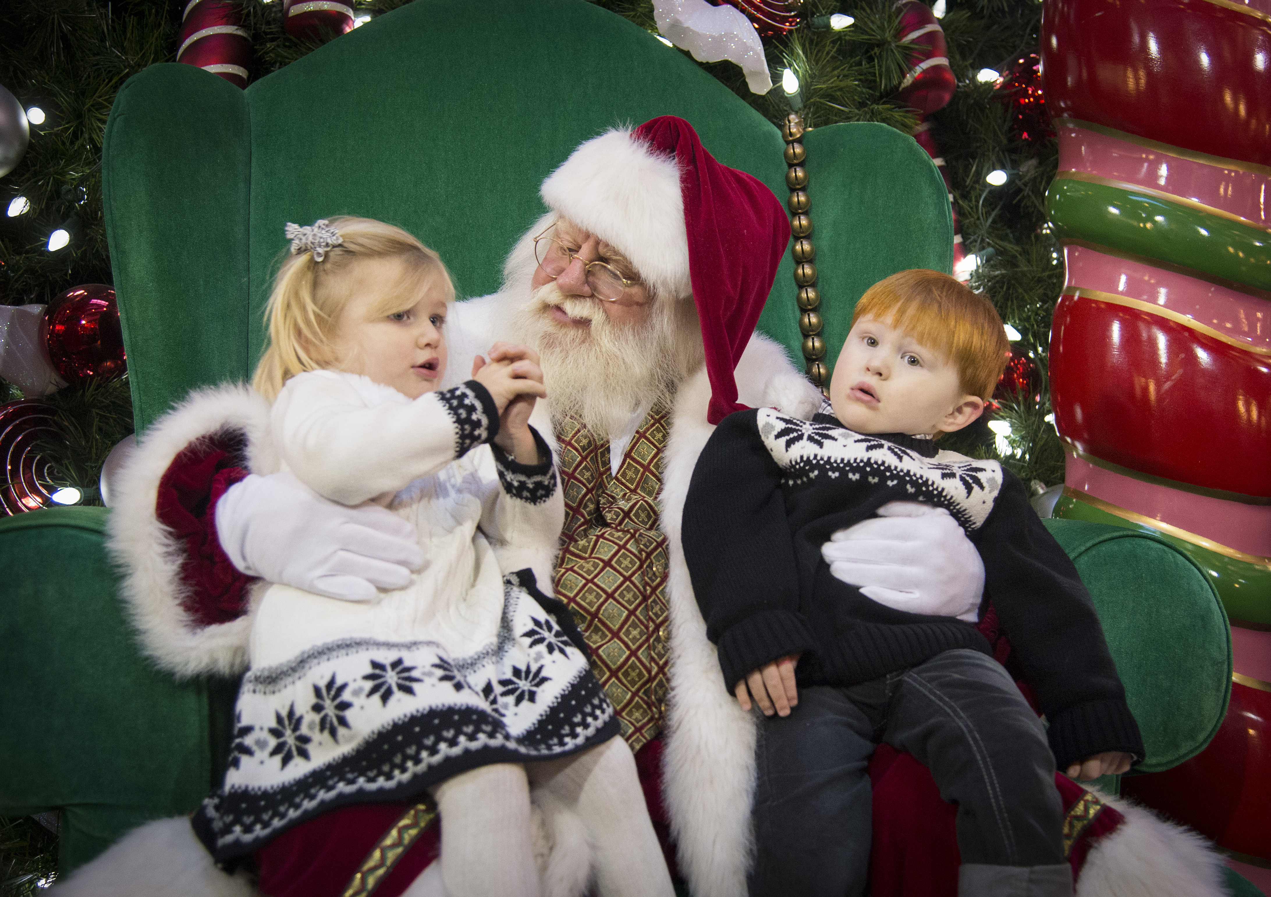 After they had their picture taken, twins, Maddie and Erik Cathcart, 2, tell Santa what they want for Christmas at River Park Square on Saturday. SR photo/Colin Mulvany