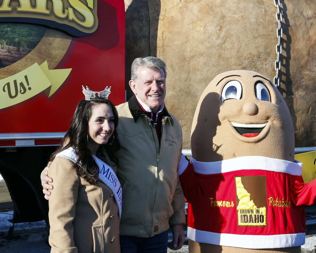 Miss Idaho Sarah Downs, Idaho Gov. C.L. “Butch” Otter and Idaho Potato mascot Spuddy Buddy pose for a photograph before the Famous Idaho Potato Bowl NCAA college football game between Buffalo and San Diego State in Boise on Saturday. San Diego State won 49-24. (AP Photo/Otto Kitsinger)