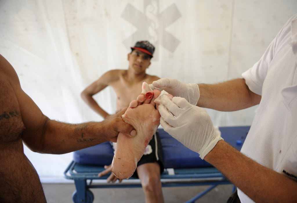 A man is treated after he was bit by a palometa, a type of piranha, while wading in the Parana River in Rosario, Argentina, Wednesday. Lifeguards director Federico Cornier said Thursday that thousands of bathers were cooling off from 100 degree temperatures in the Parana River on Wednesday when bathers suddenly came to them complaining of bite marks on their hands and feet. You write the cutline. Story here. (AP Photo/La Capital, Silvina Salinas)