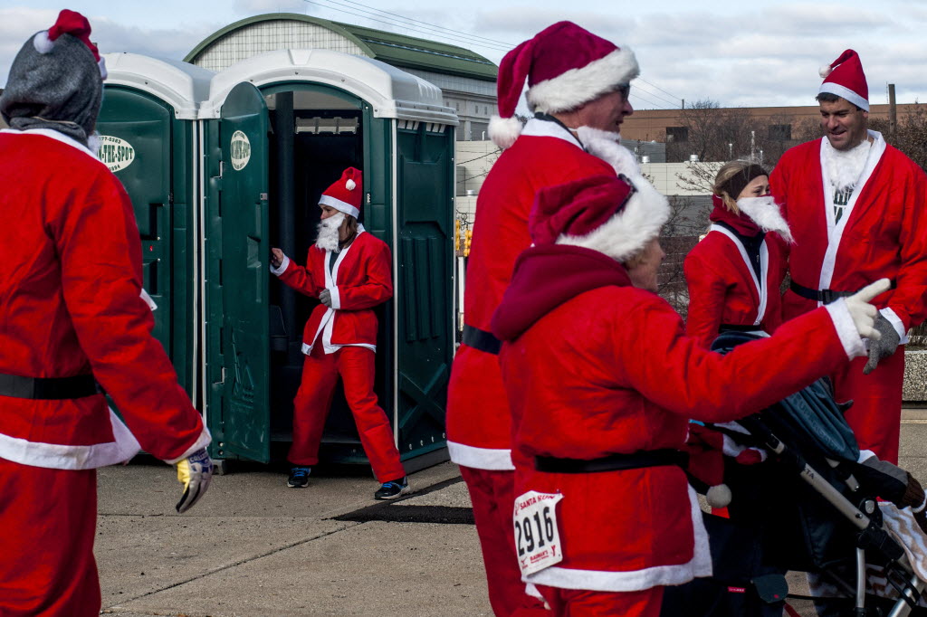 Whitley Huelskamp exits the portable toilet before running in the fourth annual Santa Run on Saturday in Flint, Mich. You write the cutline. (AP Photo/The Flint Journal, Jake May)