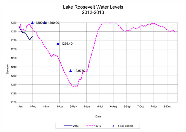 The flood control elevations for Lake Roosevelt have been issued based on the January water supply forecast. These levels are the maximum elevation for Lake Roosevelt. Other factors such as power demand can result in elevations under the flood control elevations.