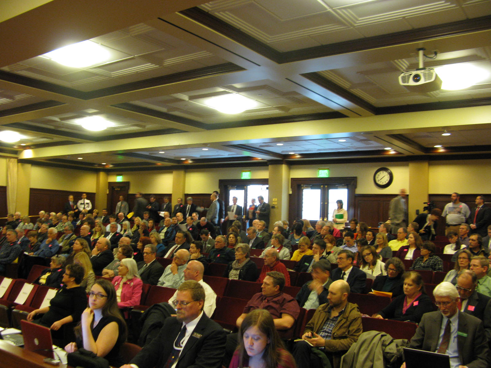 The Capitol Auditorium is filling up once again this afternoon for the Senate Commerce Committee’s continued hearing on the governor’s proposal for a state-based health insurance exchange. The committee is scheduled to vote today at the end of its 90-minute meeting, regardless of how many have gotten to speak; so far, more than 95 people have signed up to testify. Just over a half-dozen testified on Tuesday.