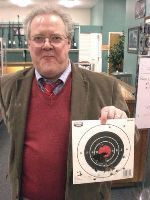 (Lewiston Tribune photo: Lewiston Rep. John “Just call me Dillinger” Rusche displays a target he shredded with a .45-caliber pistol — showing that Democrats can shoot, too)