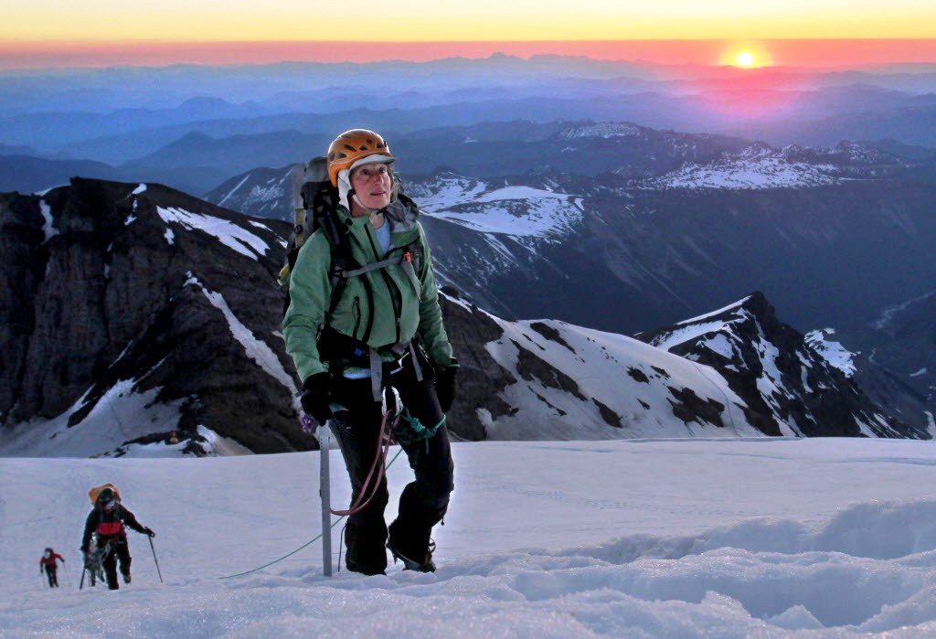 In a July 9, 2010 photo, Sally Jewell, CEO of REI, leads a five-woman team up the Emmons Glacier and ultimately to the top of Mt. Rainier as the sun rises. (AP Photo/The News Tribune, Janet Jensen)